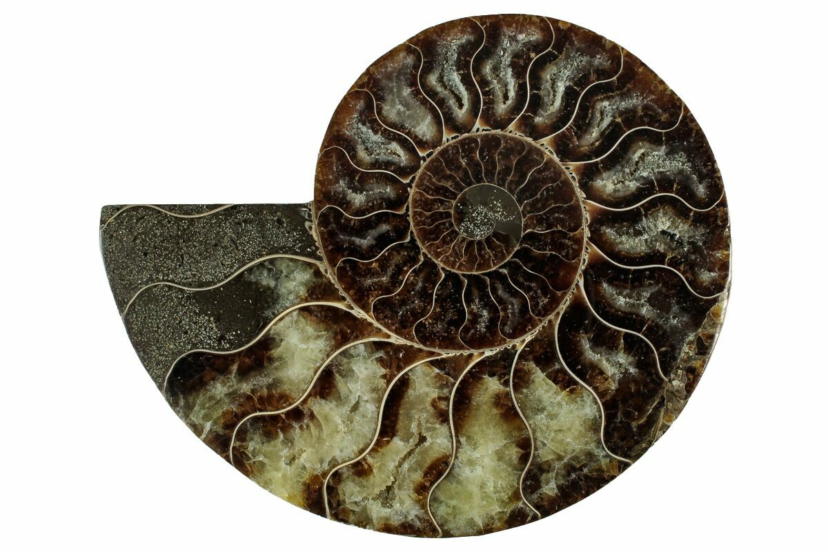 Here is a beautiful, 4.8" wide, cut and polished Cleoniceras ammonite fossil from Madagascar. These ammonites are Cretaceous in age, approximately 110 million years old. This specimen exhibits gorgeous mineralization within the chambers, each separated by white calcite septa (divisions). This highly polished, exotic ammonite makes a superb display piece with tremendous historical appeal.