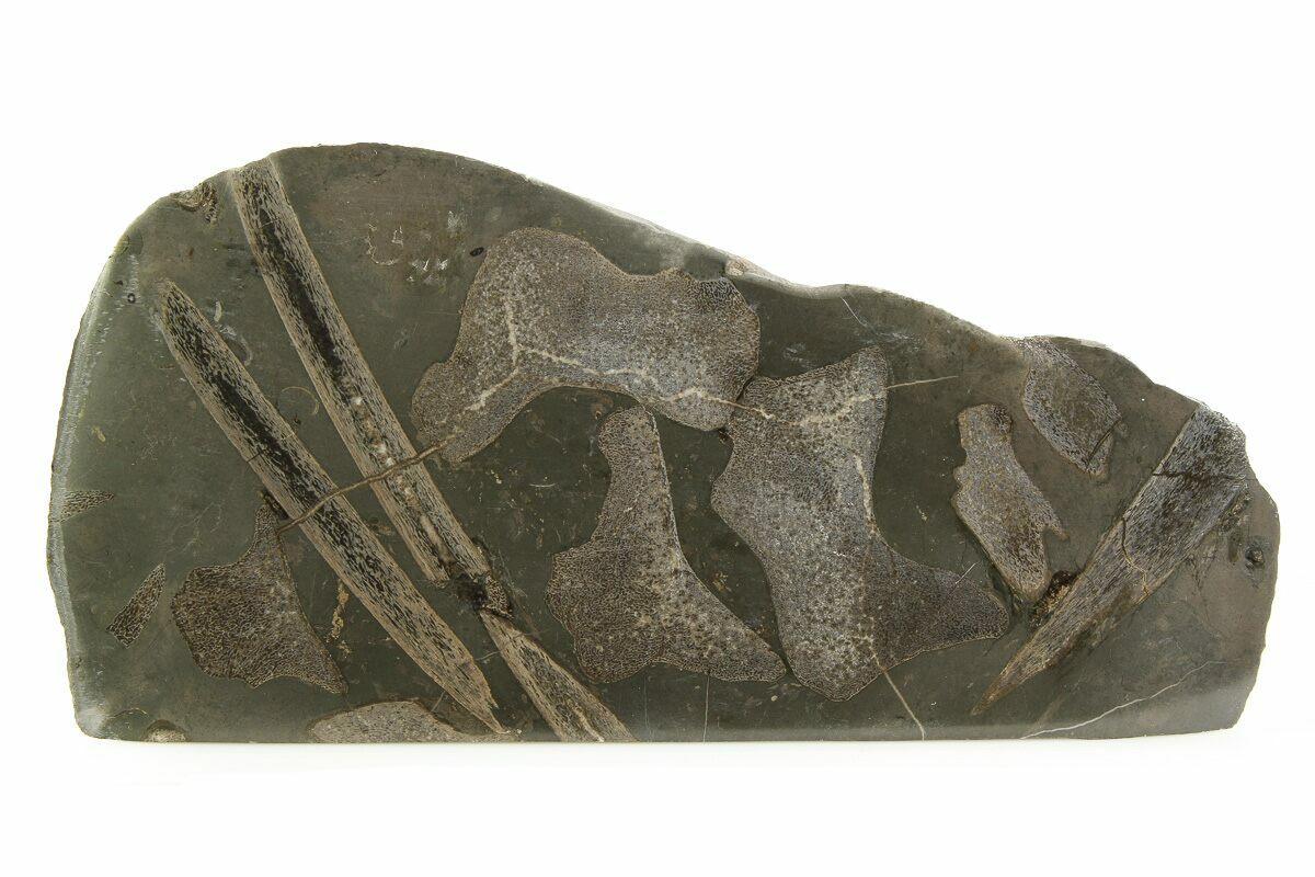 This is a 4.8" long concretion section containing several Ichthyosaurus bones. The concretion has been cut flat and polished, allowing the vertebrae to be seen in cross-section. It was collected from the Lower Jurassic Falciferum Zone in North Whitby, England.