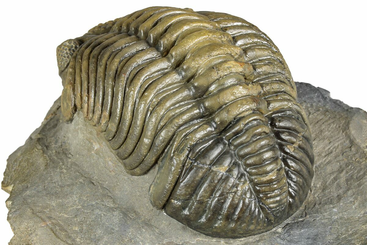 This is a very large, prone specimen of Pedinopariops vagabundus from Mrakib, Morocco. It would be about 4.8" long if outstretched and has a natural, multi-toned shell coloration. Excellent preparation and good eye facet preservation in both eyes. It only have about 3% shell restoration in total, mainly on the pluerals.