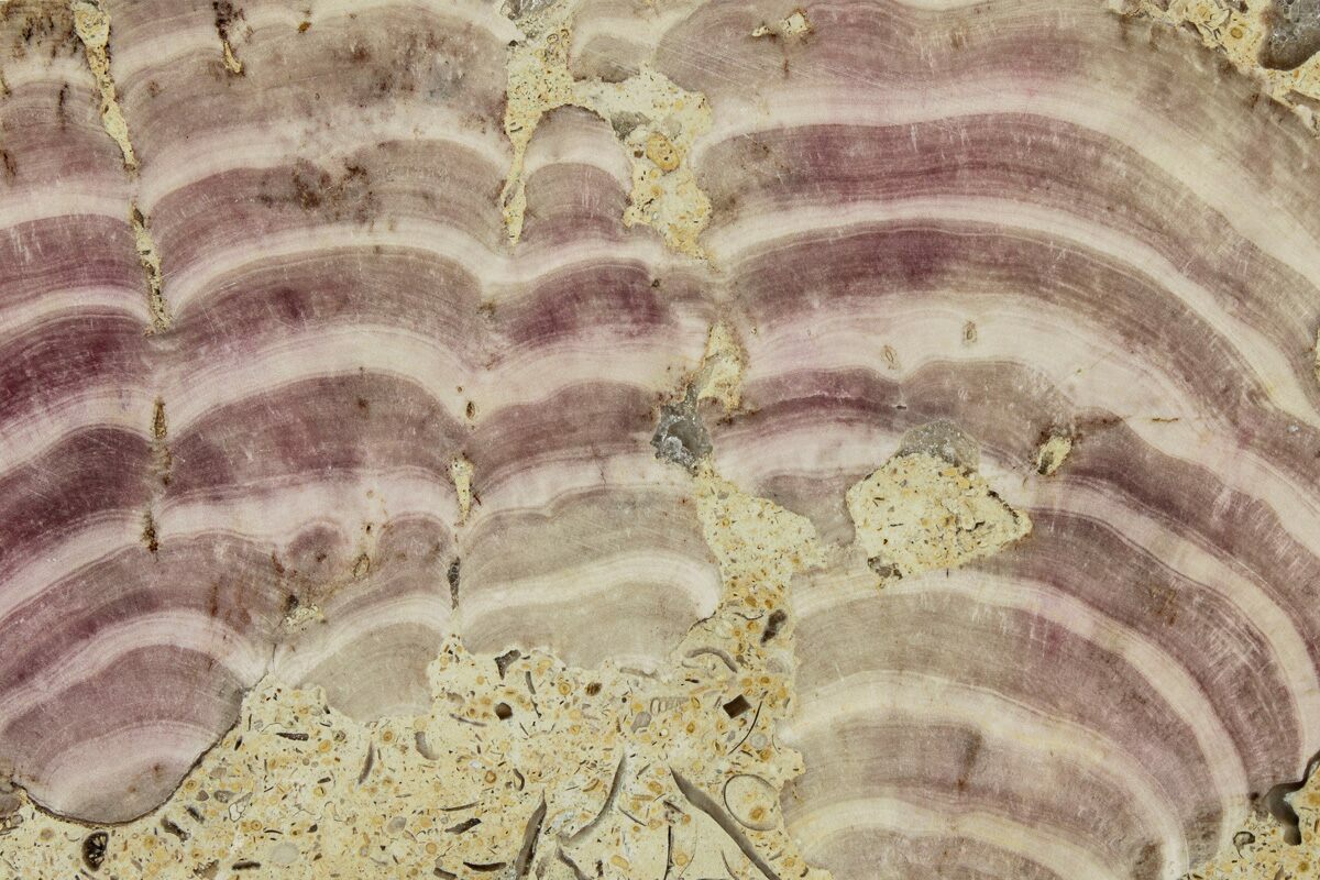 This is a Jurassic-aged fossil chaetetid sponge of the species Solenopora jurassica from Gloucestershire, England. Locally these sponge fossils are known as "Beetroot Rock" because of their coloration. The fossil has been cut and polished to a glossy finish to highlight the intricate details.