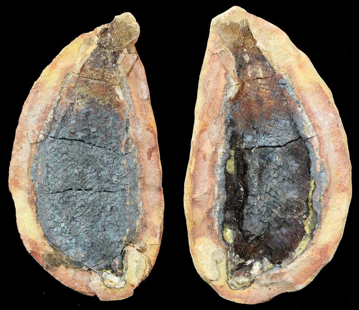 This is a Lower Triassic (247 million year old) fossil fish from preserved inside of a concretion. These uniquely preserved fish are found by cracking open the hard concretions, and show amazing detail such as scales and fins. There are about half a dozen different fish described from this location and this one is Boreosomus gillioti.