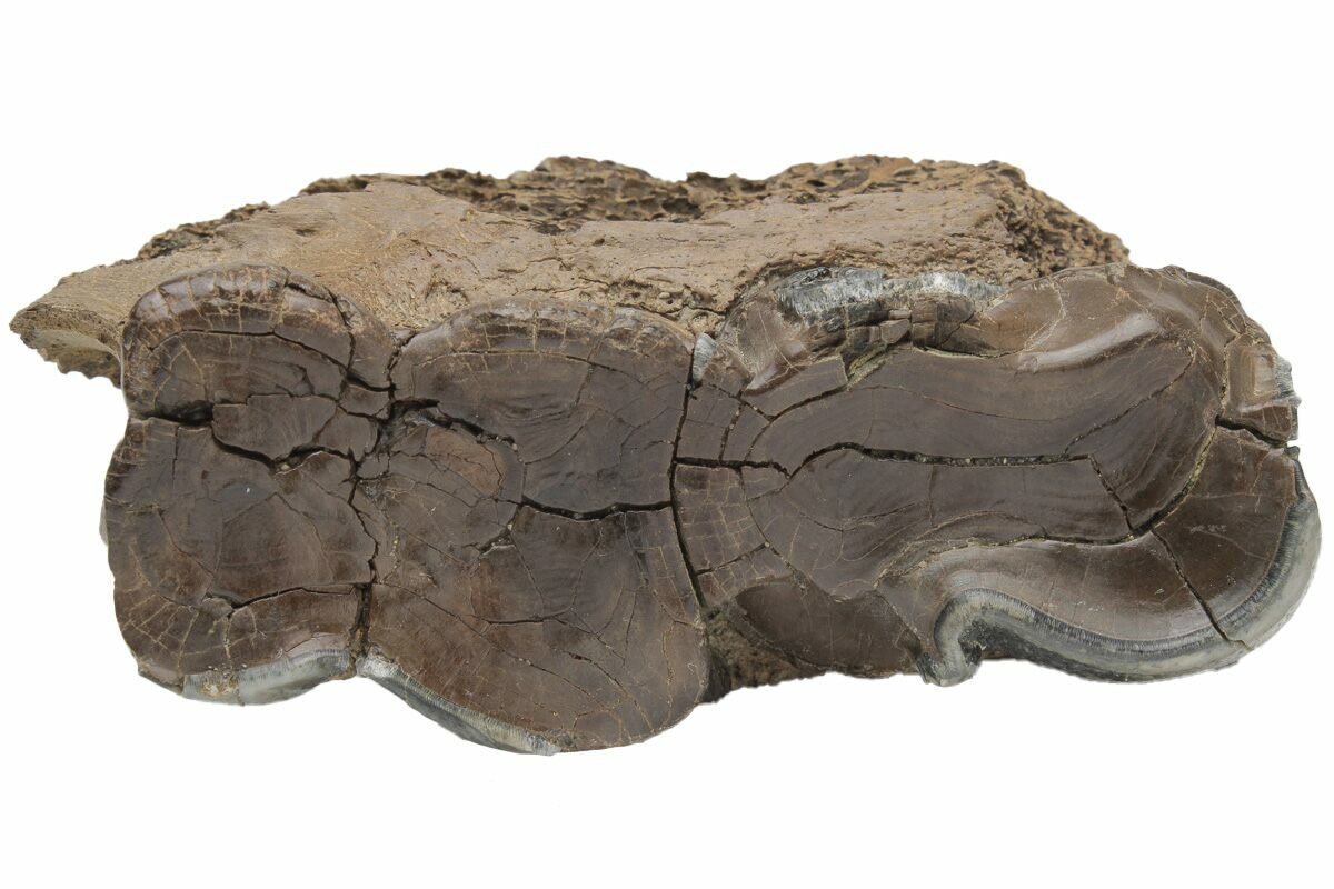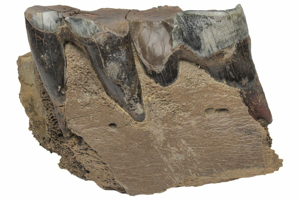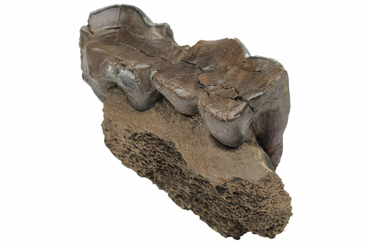 This is a beautifully preserved fossil jaw section from a woolly rhinoceros (Coelodonta antiquitatis). The jaw has two of its original molars still in place, both of which are in great condition. This fossil comes from Siberia, Russia, where many Woolly Mammoth and Rhino fossils are unearthed. It didn't require any crack repair or restoration.