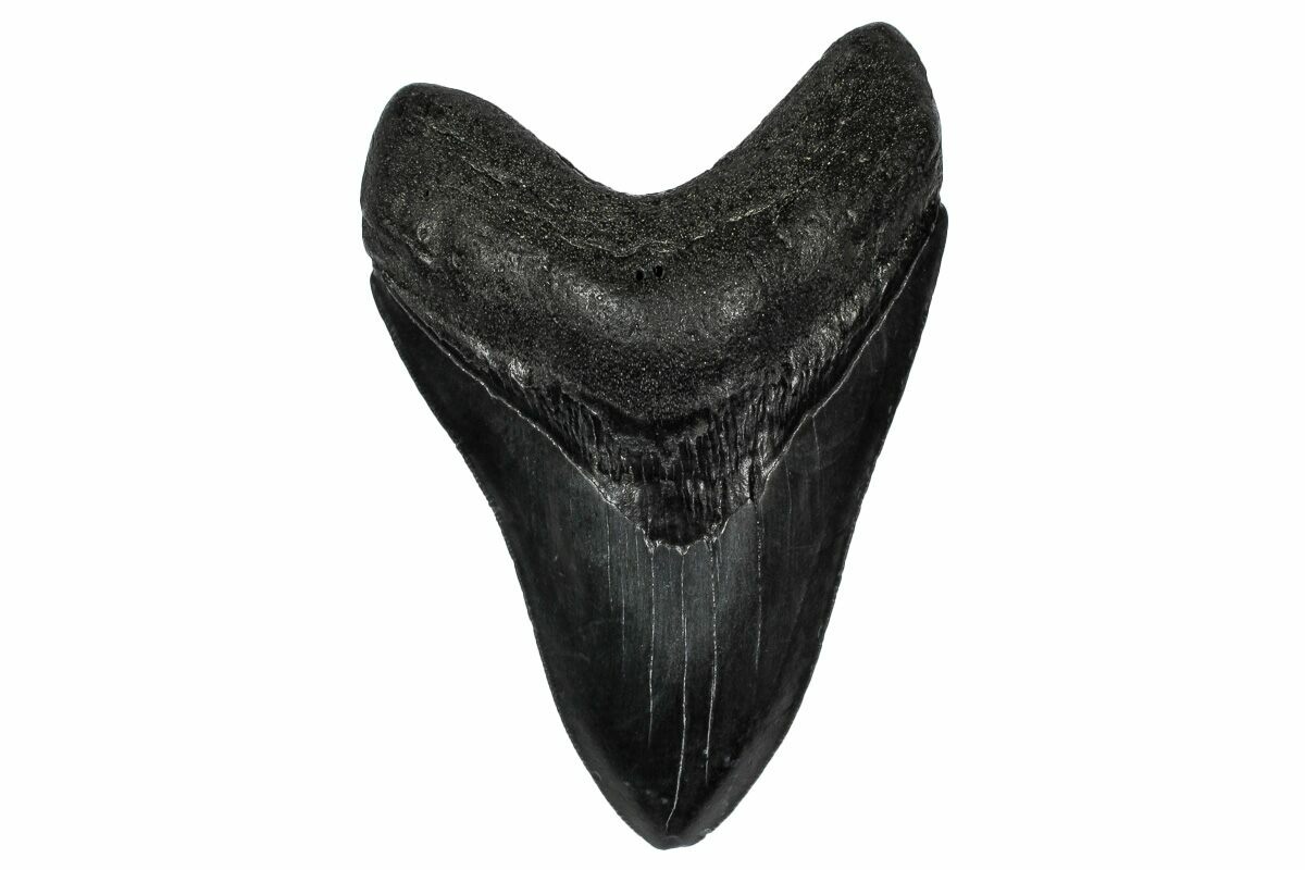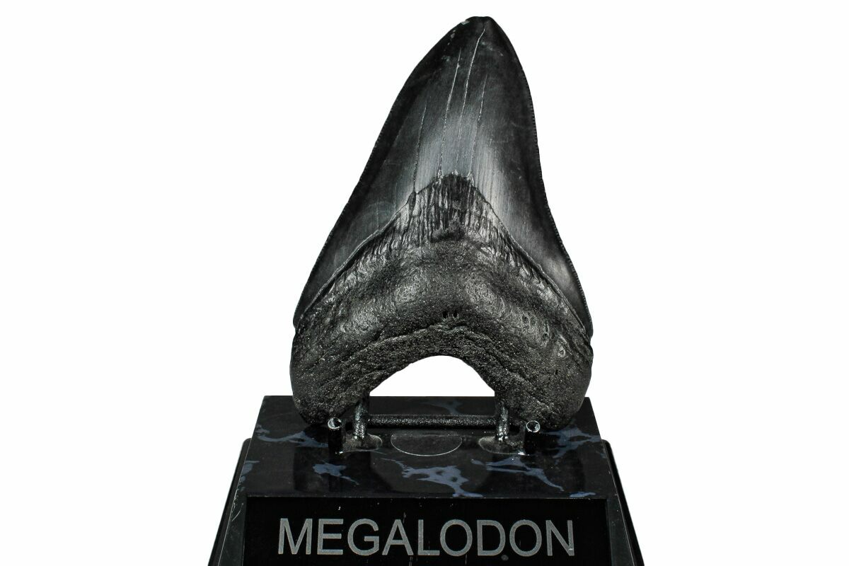 The standard measure for megalodon teeth is slant height, or the longest edge of the tooth. Adult megalodon teeth were typically in the 4 to 5 inch range: teeth over 6 inches are rare and represent super-sized individuals. Only a handful of teeth have ever been found over seven inches.