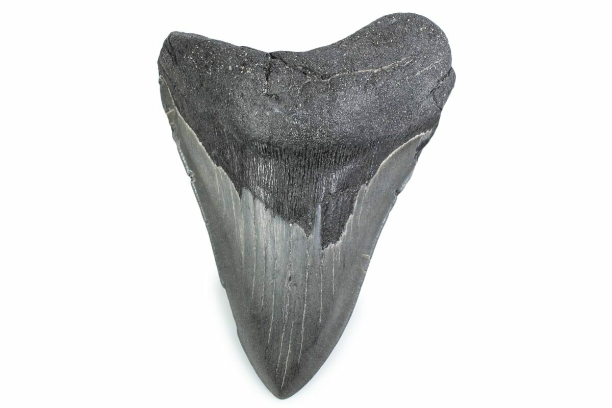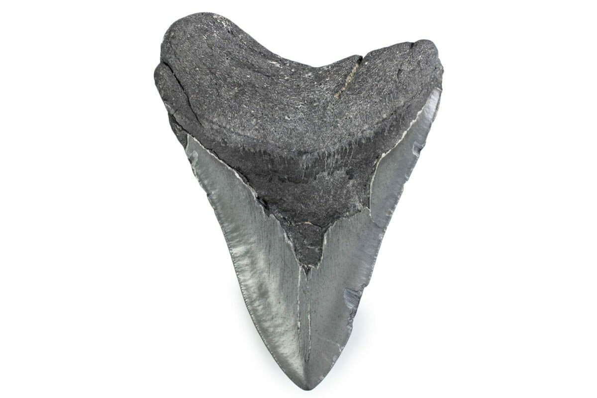 The standard measure for megalodon teeth is slant height, or the longest edge of the tooth. Adult megalodon teeth were typically in the 4 to 5 inch range: teeth over 6 inches are rare and represent super-sized individuals. Only a handful of teeth have ever been found over seven inches.