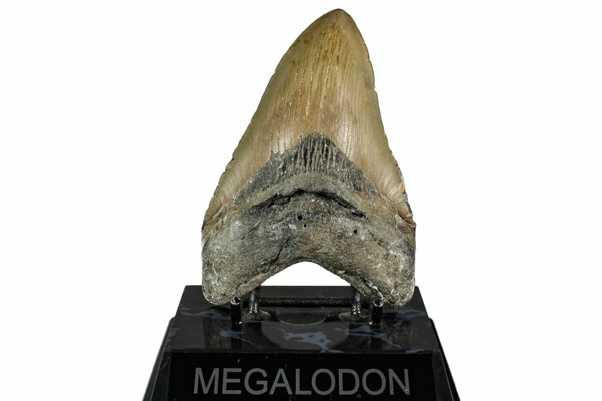 This is a 4.86" long megalodon tooth collected on the North Carolina coast. It was found by commercial divers collecting "the ledges" in about 100 feet of water. It would have eroded out of the Pungo River Formation, putting its age in the range of 13.8 to 16 million years old. A tooth of this size would have come from a prehistoric, mega-shark in the 35+ foot size range.