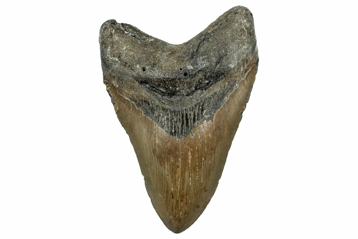 The standard measure for megalodon teeth is slant height, or the longest edge of the tooth. Adult megalodon teeth were typically in the 4 to 5 inch range: teeth over 6 inches are rare and represent super-sized individuals. Only a handful of teeth have ever been found over seven inches.