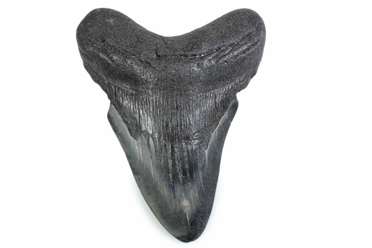 The standard measure for megalodon teeth is slant height, or the longest edge of the tooth. Adult megalodon teeth were typically in the 4 to 5 inch range: teeth over 6 inches are rare and represent super-sized individuals. Only a handful of teeth have ever been found over seven inches.