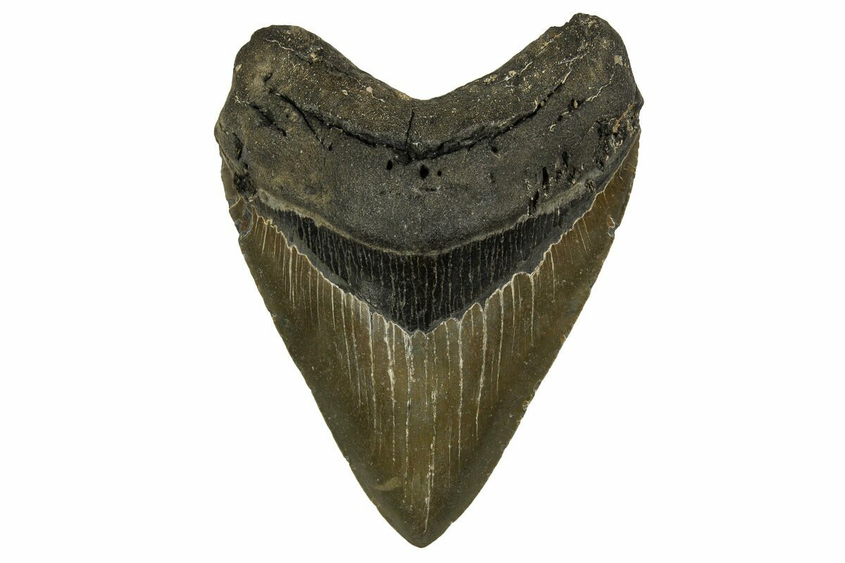 This is a 4.89" long megalodon tooth collected on the North Carolina coast. It was found by commercial divers collecting "the ledges" in about 100 feet of water. It would have eroded out of the Pungo River Formation, putting its age in the range of 13.8 to 16 million years old. A tooth of this size would have come from a prehistoric, mega-shark in the 35+ foot size range.