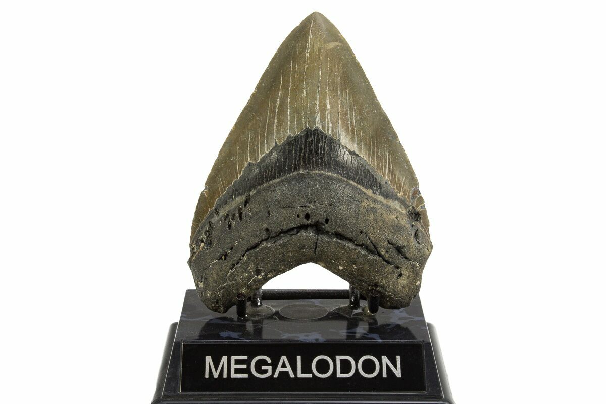 The standard measure for megalodon teeth is slant height, or the longest edge of the tooth. Adult megalodon teeth were typically in the 4 to 5 inch range: teeth over 6 inches are rare and represent super-sized individuals. Only a handful of teeth have ever been found over seven inches.