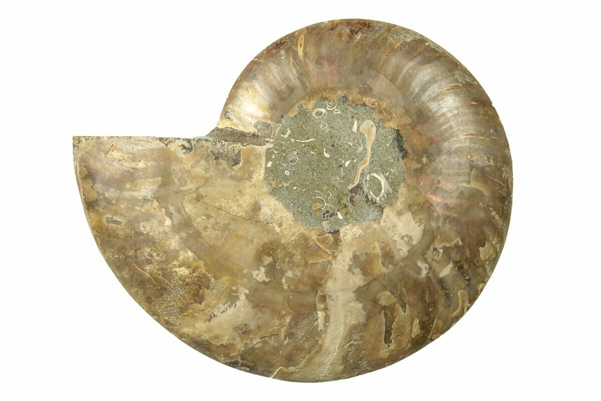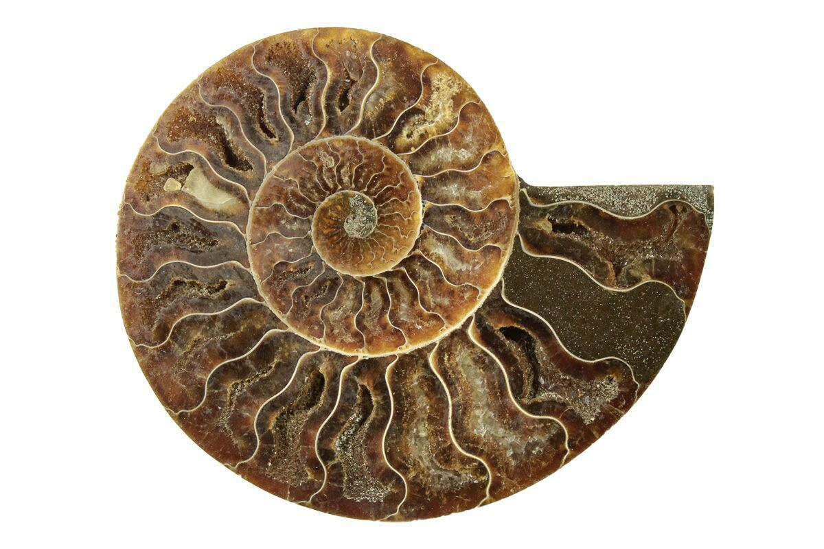 This specimen exhibits gorgeous mineralization within the chambers, each separated by white calcite septa (divisions). This highly polished, exotic ammonite makes a superb display piece with tremendous historical appeal.