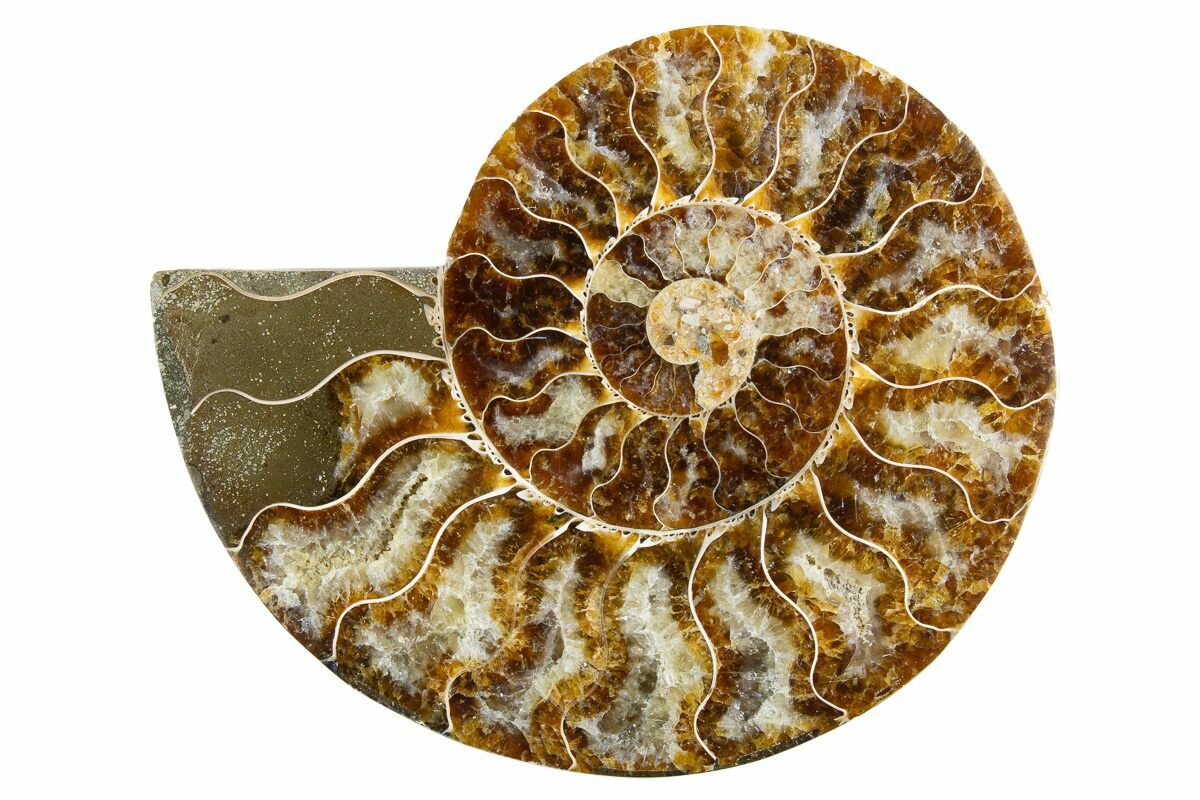 Here is a beautiful, 4.9" wide, cut and polished Cleoniceras ammonite fossil from Madagascar. These ammonites are Cretaceous in age, approximately 110 million years old. This specimen exhibits gorgeous mineralization within the chambers, each separated by white calcite septa (divisions). This highly polished, exotic ammonite makes a superb display piece with tremendous historical appeal.