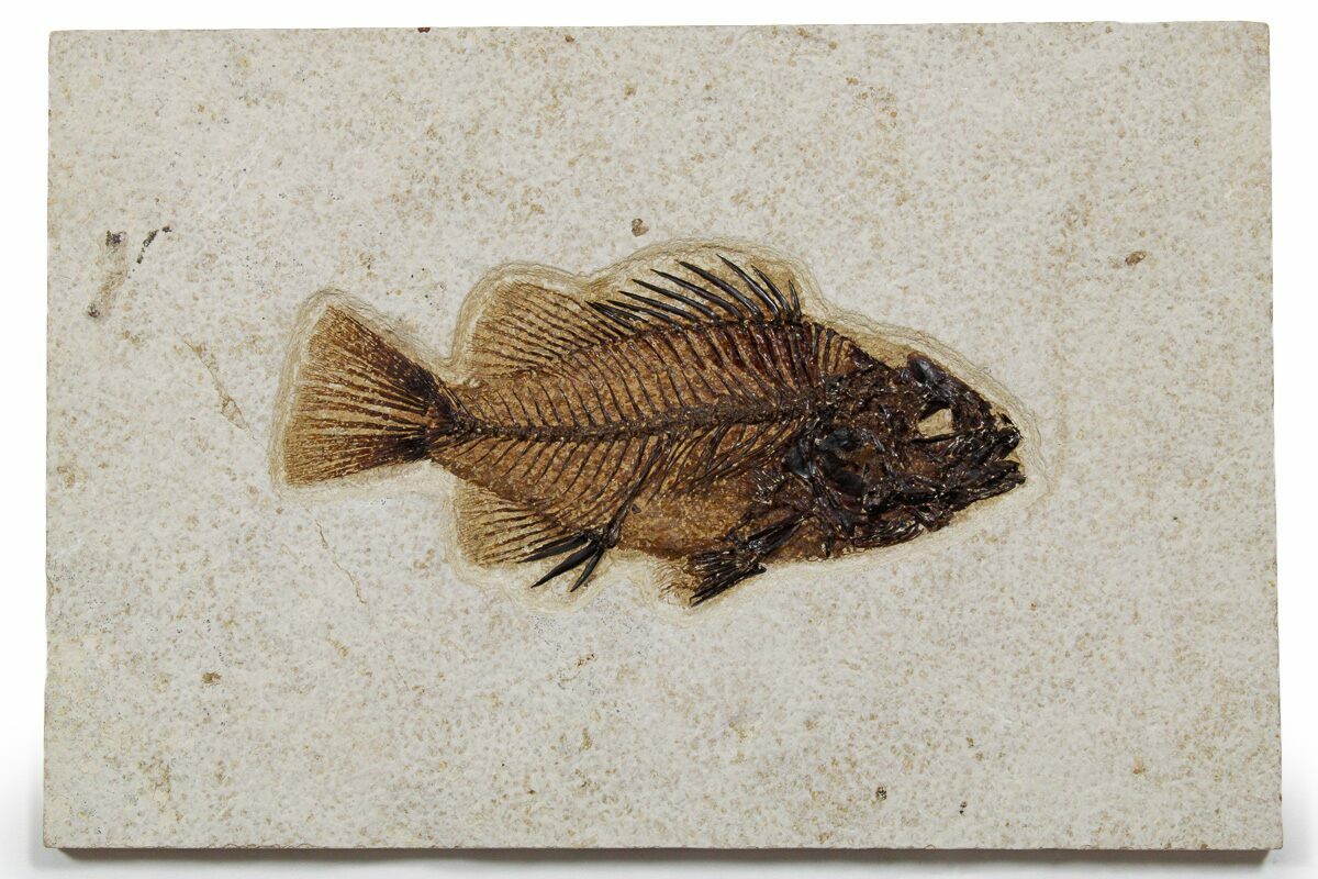 Specimens like this come from the coveted 18 inch layer of the Green River Formation, which produces darker and more detailed fish than the majority on the market. The rock from this layer is much harder and more durable than other layers in the formation, likely due to its initial deposition conditions in deep water. Because of these conditions, fish found in the 18-inch layer can be extracted whole and in excellent condition. This layer is typically collected at night using low-angle light to see the bump in the rock that the fish's backbone creates. They then cut these fish out and take them to a lab where the fish, which may be up to an inch under the surface of the rock, are meticulously extracted under microscope with hand tools.