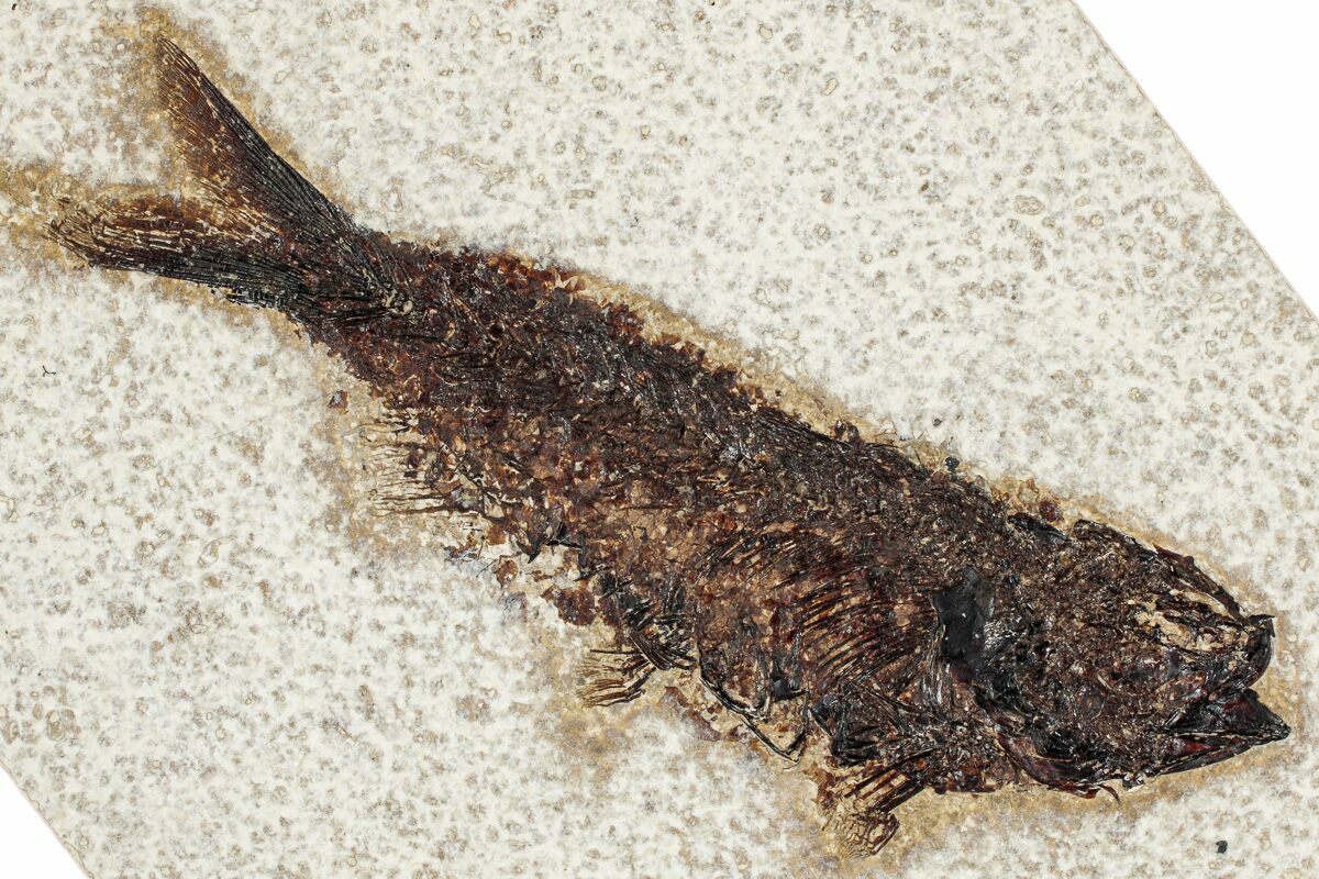 Specimens like this come from the coveted 18 inch layer of the Green River Formation, which produces darker and more detailed fish than the majority on the market. The rock from this layer is much harder and more durable than other layers in the formation, likely due to its initial deposition conditions in deep water. Because of these conditions, fish found in the 18-inch layer can be extracted whole and in excellent condition. This layer is typically collected at night using low-angle light to see the bump in the rock that the fish's backbone creates. They then cut these fish out and take them to a lab where the fish, which may be up to an inch under the surface of the rock, are meticulously extracted under microscope with hand tools.