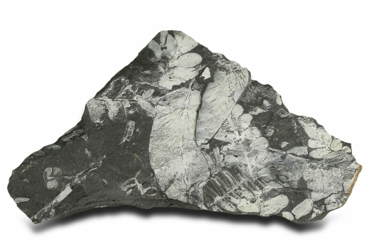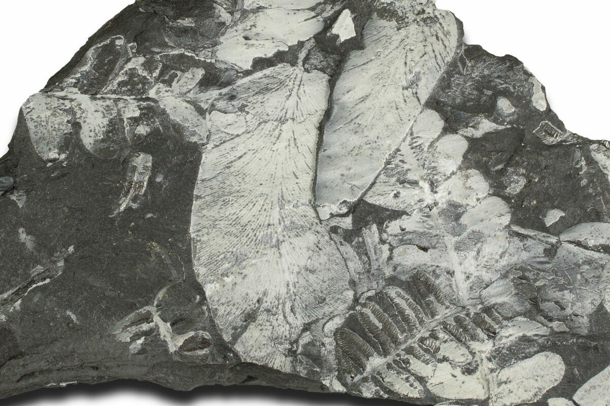 These plants were buried in a swamp where a low temperature, low pressure, and low oxygen environment caused the plant tissue to be slowly replaced by pyrite. This pyrite was later replaced by a whitish mineral (aluminum silicate) as the fossils were buried and exposed to the heat and pressure inside of the earth. The majority of the ferns on these plates are of the genus Alethopteris, though Pecopteris ferns can be seen from time to time.