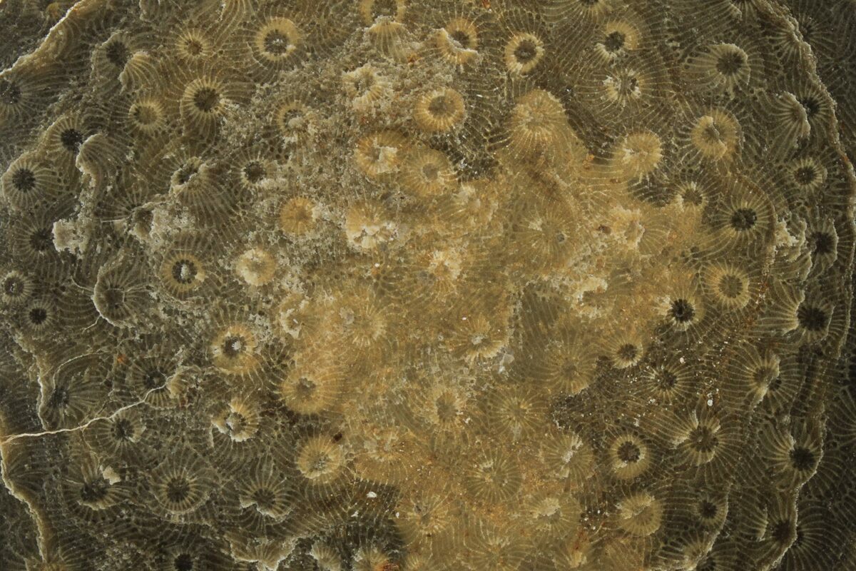 This is a polished slab of rugose coral, collected from a Middle Devonian marine deposit in Smara, Western Sahara, Morocco. Under magnification, the detailed preservation of the coral is exquisite. Both faces of this specimen have been cut flat and polished to a glossy finish. The periphery has been left in its rough, natural state.