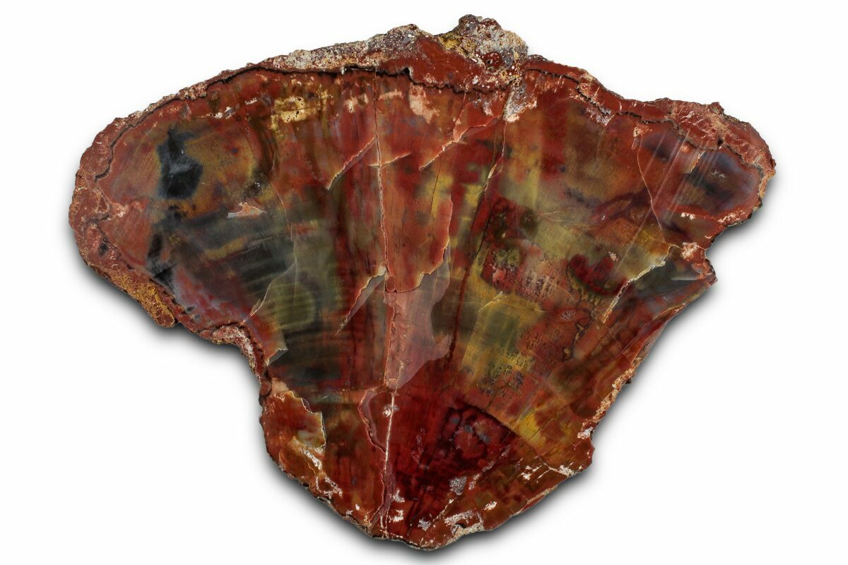 This is a brilliantly colored, 4.9" wide section of petrified wood (Araucarioxylon) from Arizona. One side of the petrified has been polished to a glossy finish, while the exterior surface has a natural texture.