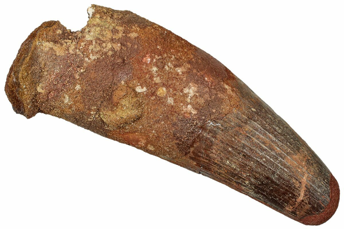 Spinosaurus teeth are relatively common fossils, but large (3+ inches), well-preserved examples are rare. These large Spinosaurus teeth will often be heavily doctored. We’ve seen many examples where multiple partial teeth can been glued to together to create a larger fake tooth, or where enamel has been painted on. One giveaway to look for is a ring of sand around the middle of the tooth, usually glued on to hide a break. Sometimes this is a sign that multiple partial teeth have been composited, but other times it is used to disguise a badly done repair job.