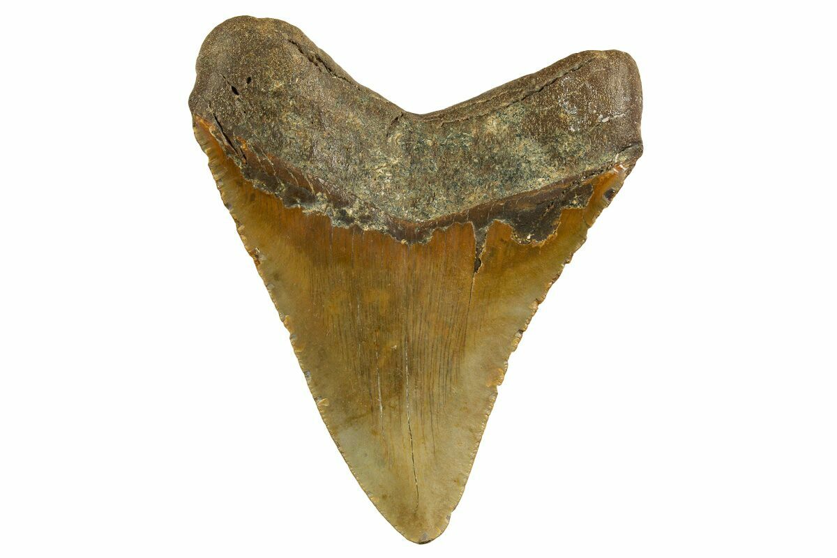 The standard measure for megalodon teeth is slant height, or the longest edge of the tooth. Adult megalodon teeth were typically in the 4 to 5 inch range: teeth over 6 inches are rare and represent super-sized individuals. Only a handful of teeth have ever been found over seven inches.
