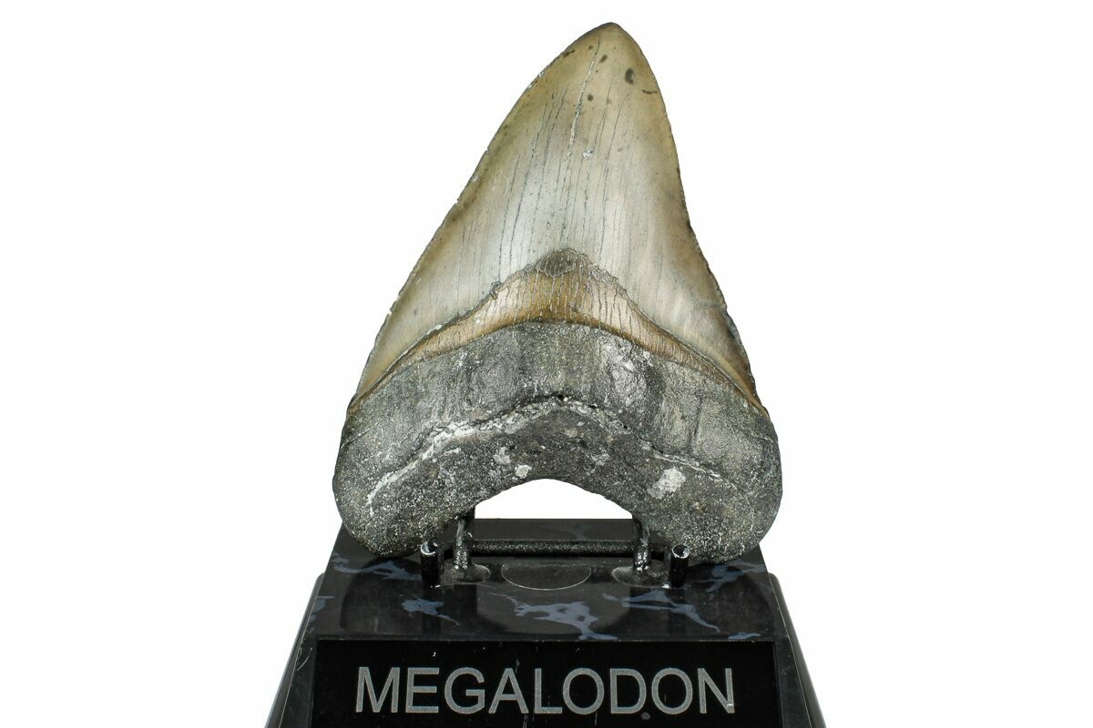 The standard measure for megalodon teeth is slant height, or the longest edge of the tooth. Adult megalodon teeth were typically in the 4 to 5 inch range: teeth over 6 inches are rare and represent super-sized individuals. Only a handful of teeth have ever been found over seven inches.