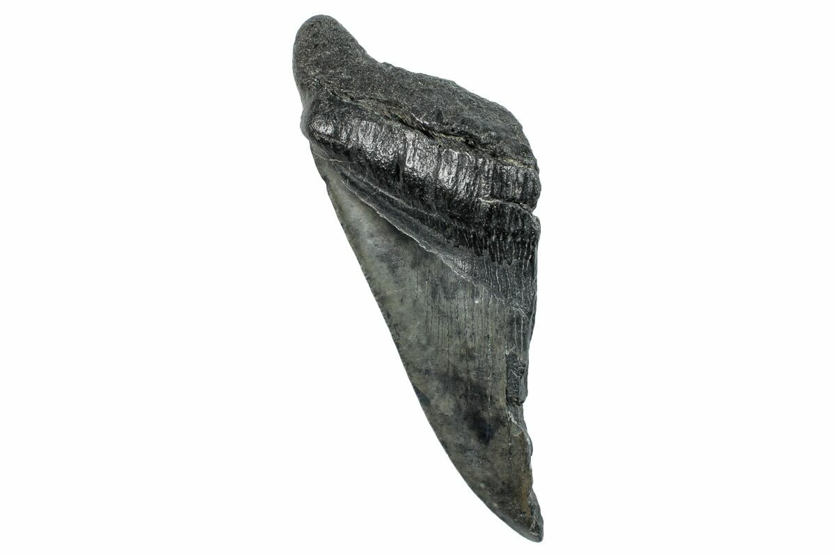This is a half of a fossil megalodon tooth collected from the Hawthorn Formation in South Carolina. Very often teeth are found broken down the middle and are much more common than finding complete unbroken teeth. The tooth would have come from an adult, prehistoric, mega-shark in the 35+ foot size range.