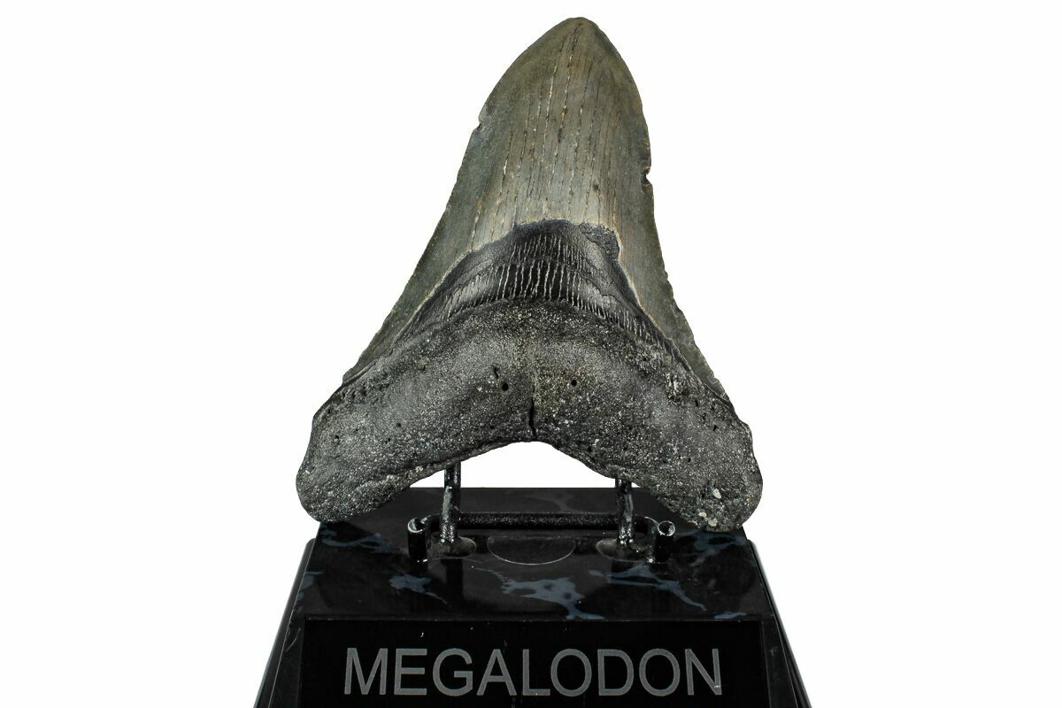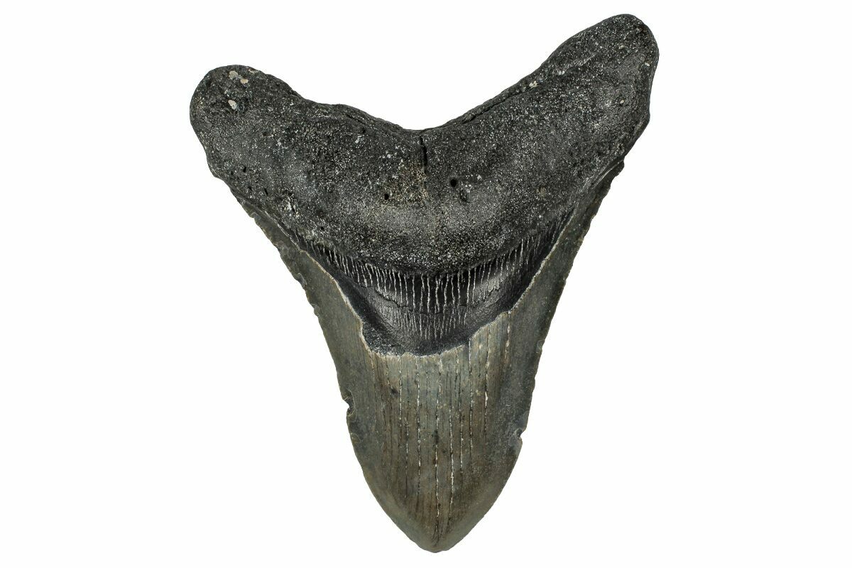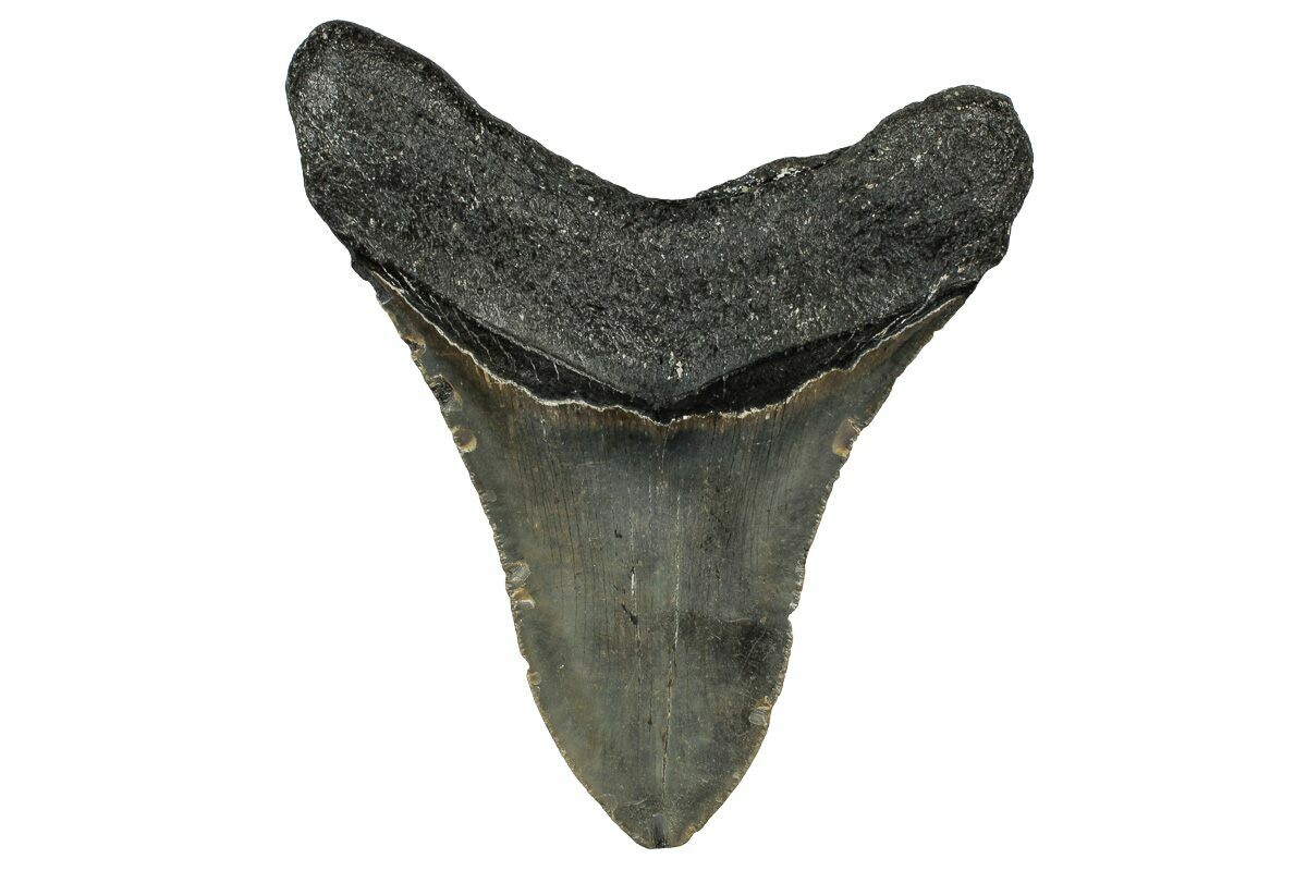 The standard measure for megalodon teeth is slant height, or the longest edge of the tooth. Adult megalodon teeth were typically in the 4 to 5 inch range: teeth over 6 inches are rare and represent super-sized individuals. Only a handful of teeth have ever been found over seven inches.