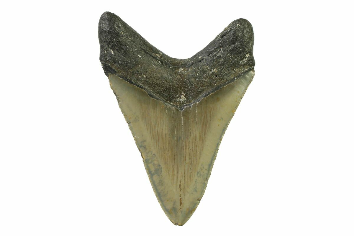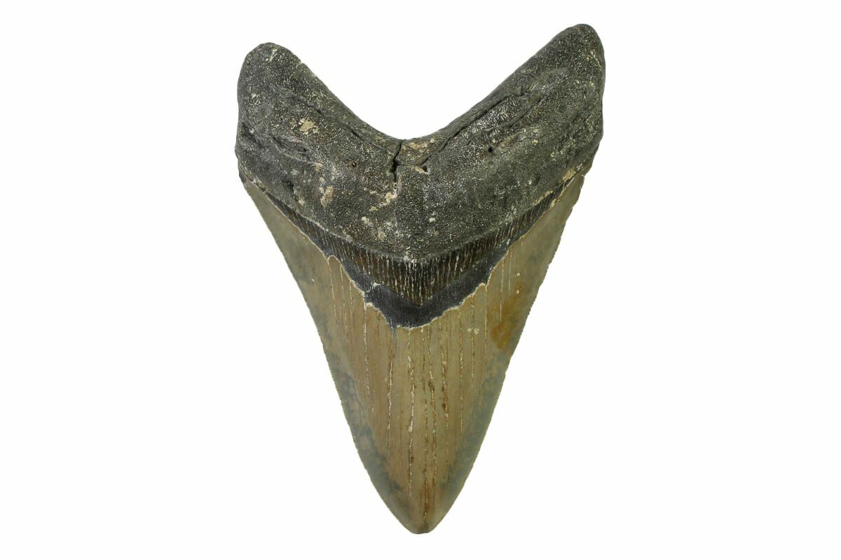The standard measure for megalodon teeth is slant height, or the longest edge of the tooth. Adult megalodon teeth were typically in the 4 to 5 inch range: teeth over 6 inches are rare and represent super-sized individuals. Only a handful of teeth have ever been found over seven inches.