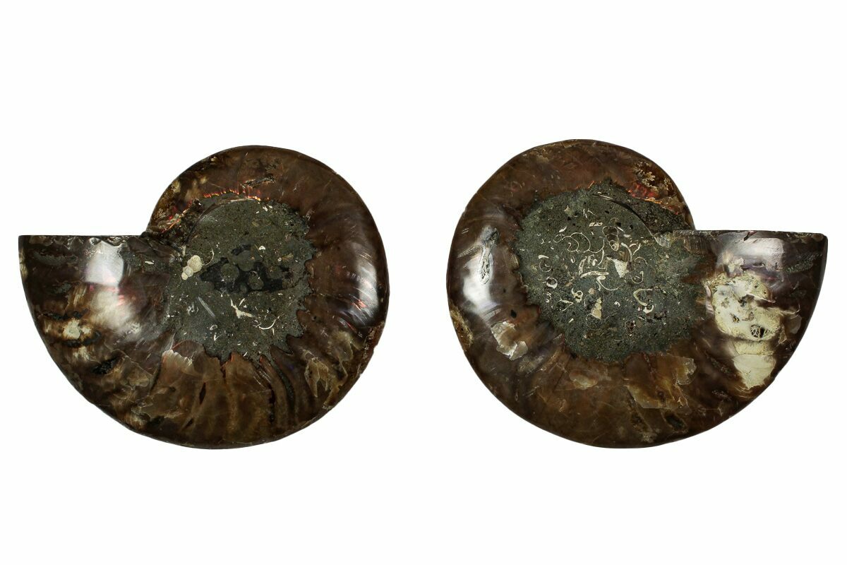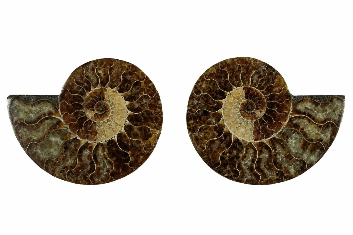 his is a beautiful 4" wide, cut and polished Cleoniceras ammonite from Ambatolafia, Madagascar, dating to the Albian Stage of the Late Cretaceous (~110 million years old). Its chambers reveal striking mineralization bordered by white calcite septa, creating an elegant, highly polished display piece. Both halves are included, along with display stands.