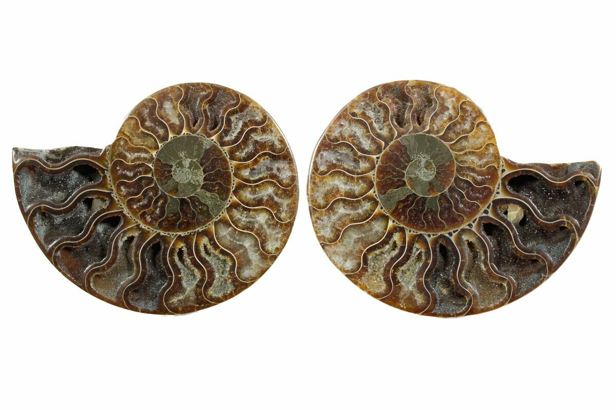 It exhibits gorgeous mineralization within the chambers, each separated by white calcite septa (divisions). This highly polished exotic ammonite makes a superb display piece with tremendous historical appeal.