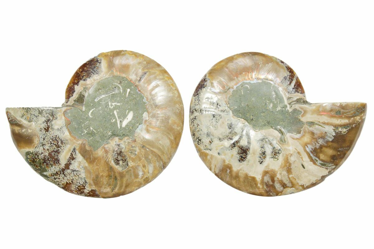 It exhibits gorgeous mineralization within the chambers, each separated by white calcite septa (divisions). This highly polished exotic ammonite makes a superb display piece with tremendous historical appeal.