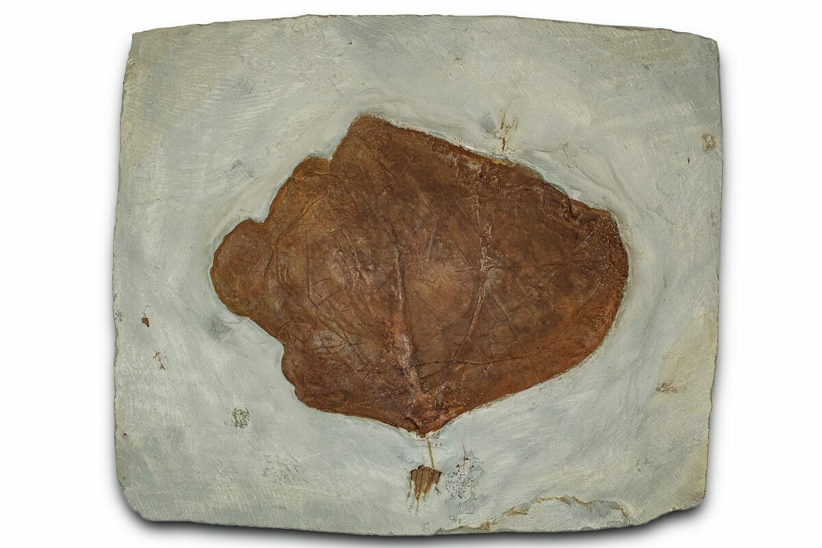 This is a 4" long (including stem) fossil leaf (Zizyphoides flabellum) from the Fort Union Formation near Glendive, Montana. The orange/brown preservation contrasts well against the shale, and many of the details in the leaf can be seen in good relief. There may be some touchups to the surface of the leaf where some of it flaked onto the negative during collection.