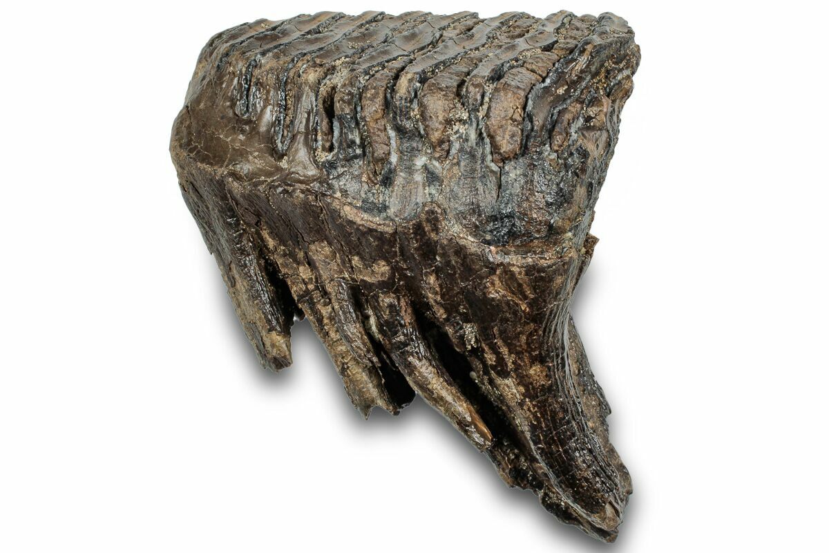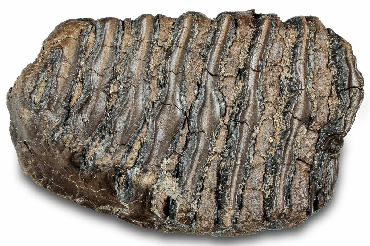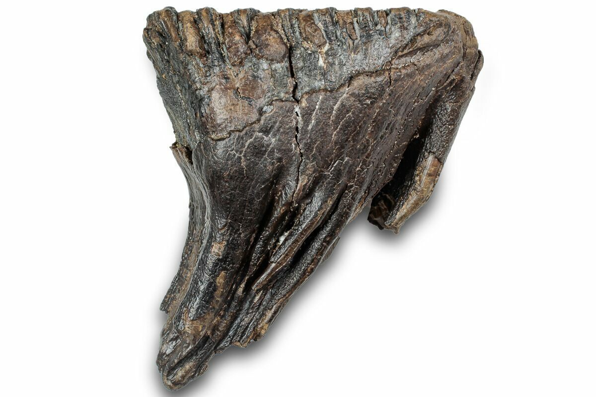 This is a 4" tall molar from a juvenile woolly mammoth (Mammuthus primigenius) which would be between 20,000 to 50,000 years old. It's in great condition with a well preserved feeding surface and partial root preservation.