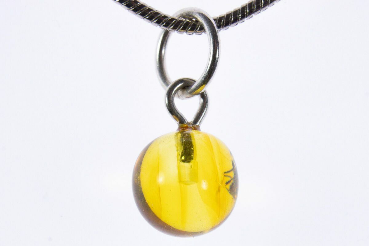 This is a .4" tall (including loop) pendant made from 44 million year old Baltic amber. Within the amber, a small fossil fly (order Diptera) can be seen. A loop has been attached to the amber, along with a secondary ring for the included 24" silver plated snake chain to complete the necklace.