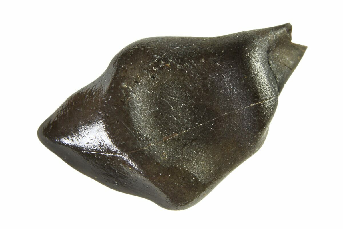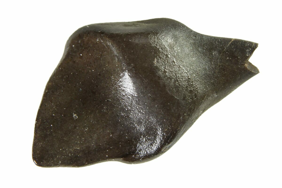 This is a .40" long tooth from a nodosaurid (Denversaurus schlessmani) dinosaur, collected from the Hell Creek Formation of Montana. The tooth is heavily worn, as are most of the nodosaur teeth we've seen from this formation.