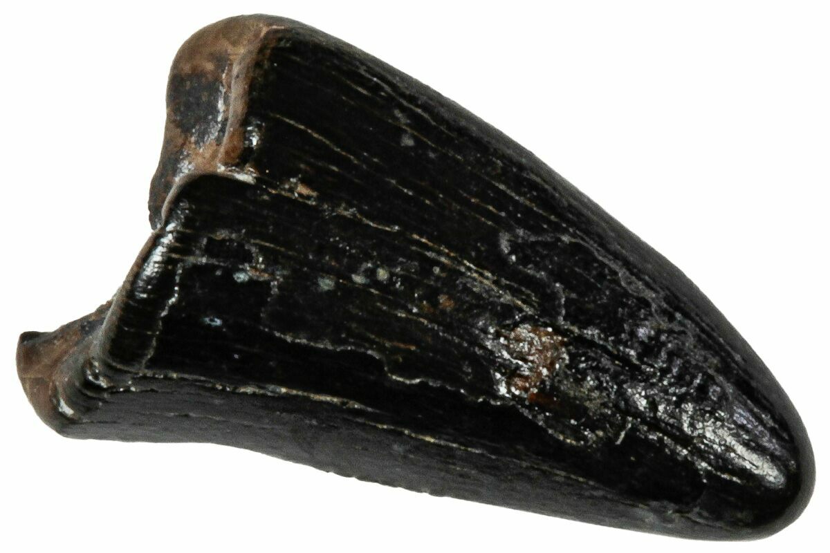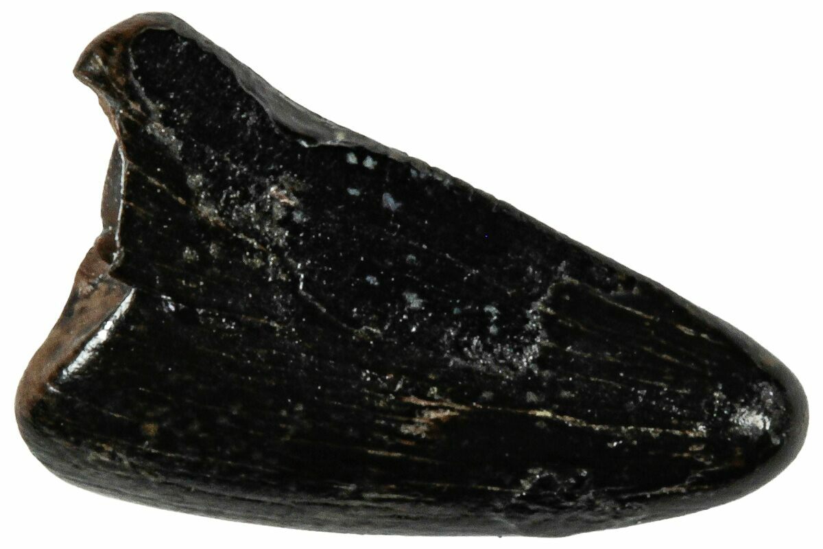 This is a .41" long juvenile tyrannosaur tooth likely of the species Nanotyrannus lancensis, collected from the Hell Creek Formation in Montana. The serrations along the edges are heavily worn.