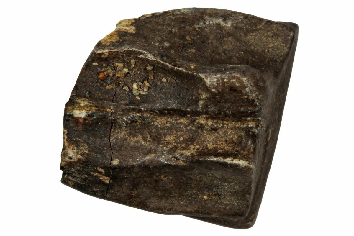 This specimen is one of those naturally shed teeth and features a polished chewing surface, showing clear evidence of the wear that came from processing vegetation millions of years ago.