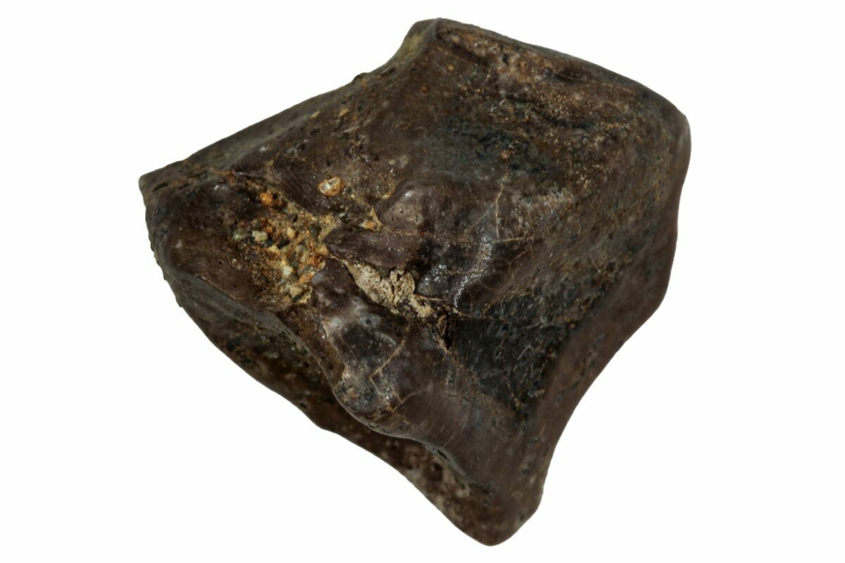 This specimen is one of those naturally shed teeth and features a polished chewing surface, showing clear evidence of the wear that came from processing vegetation millions of years ago.