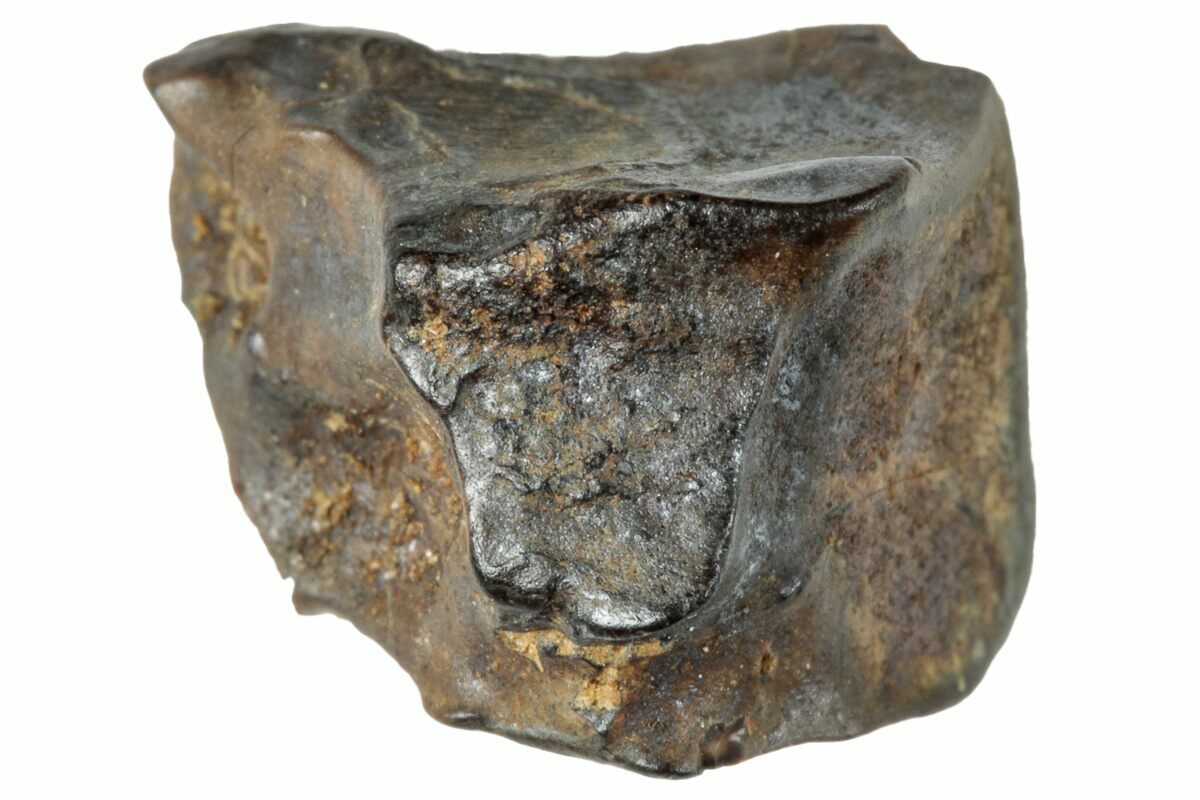 This is a .45" tooth from an unidentified hadrosaur from the Late Cretaceous-aged Judith River Formation of Montana. This tooth is a shed tooth or "spitter" and has a polished upper surface indicative of a lot of wear from grinding food.