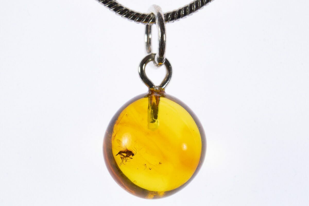 This is a .45" tall (including loop) pendant made from 44 million year old Baltic amber. Within the amber, a small fossil fly (order Diptera) can be seen. A loop has been attached to the amber, along with a secondary ring for the included 24" silver plated snake chain to complete the necklace.