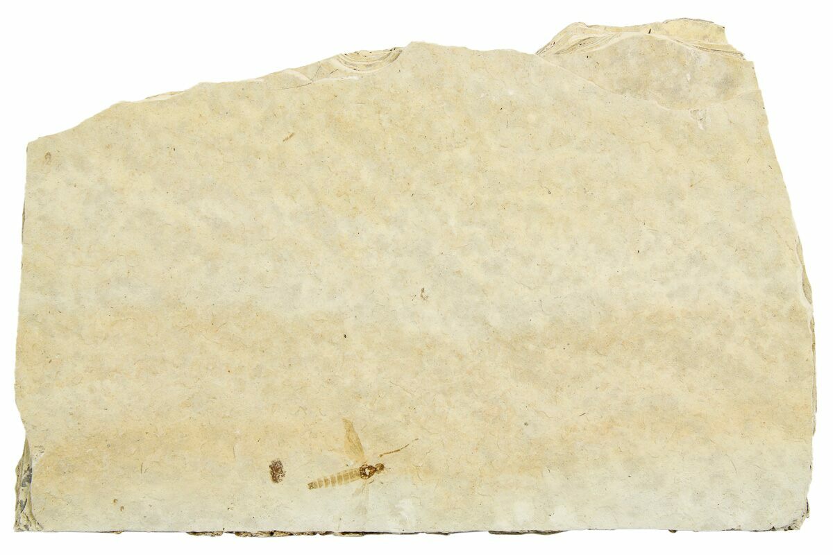 This is a beautifully preserved fossil fly (order Diptera) of the genus Plecia, collected from an Oligocene-aged shale deposit near Cereste in Southern France. It measures .46" wide and shows detailed leg, wing, and body preservation.