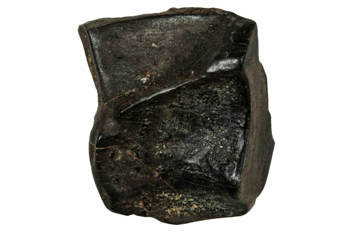 This specimen is one of those naturally shed teeth and features a polished chewing surface, showing clear evidence of the wear that came from processing vegetation millions of years ago.