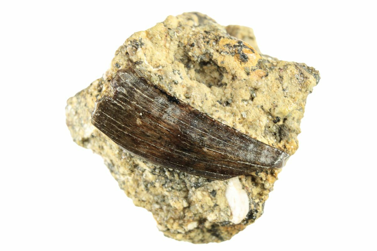 The tooth has been left on a small piece of rock that it was found in. Under magnification, small serrations can be seen along the distal edge. Comes in an acrylic display case.