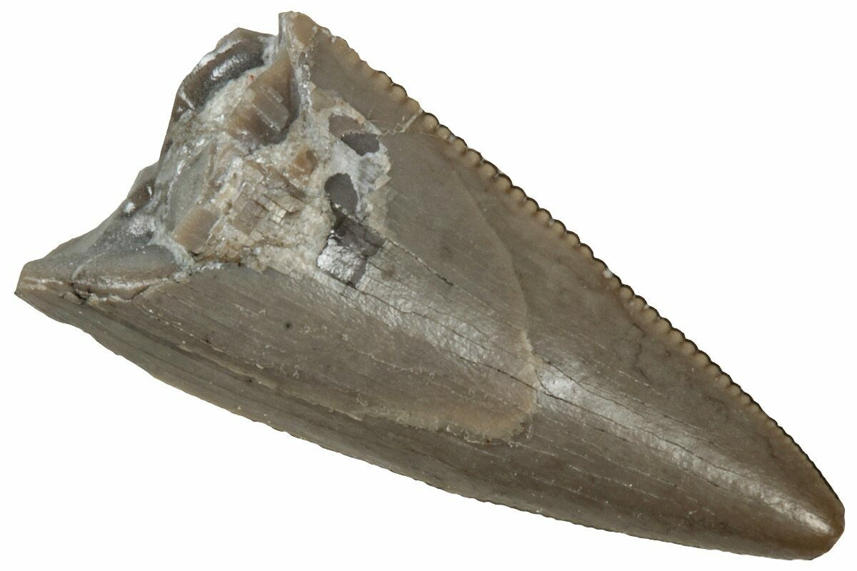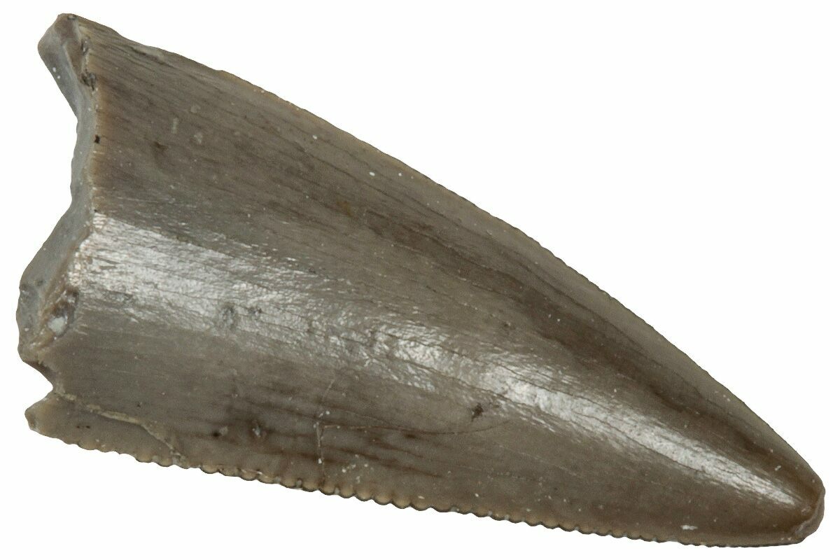 This is a .46" long, serrated, Triassic reptile (Postosuchus?) tooth from the Chinle Formation of Arizona. It has beautiful black-grey preservation and fine serrations.