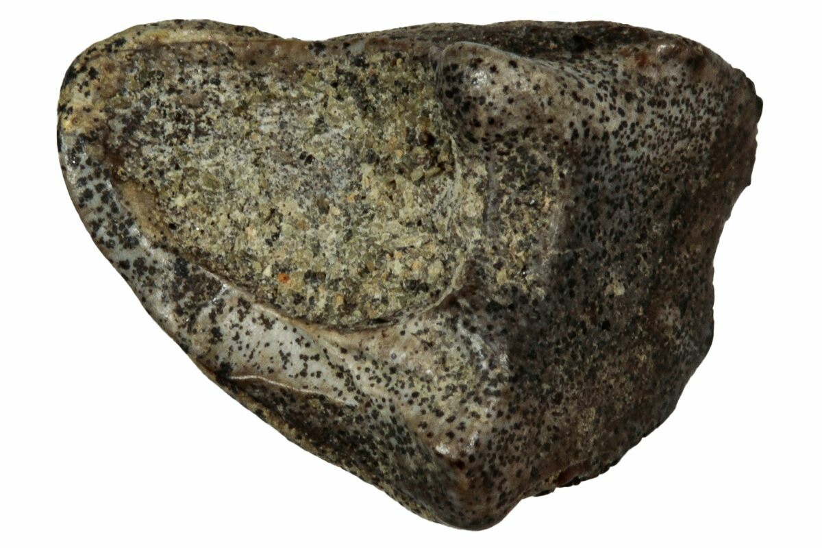 This specimen is one of those naturally shed teeth and features a polished chewing surface, showing clear evidence of the wear that came from processing vegetation millions of years ago.