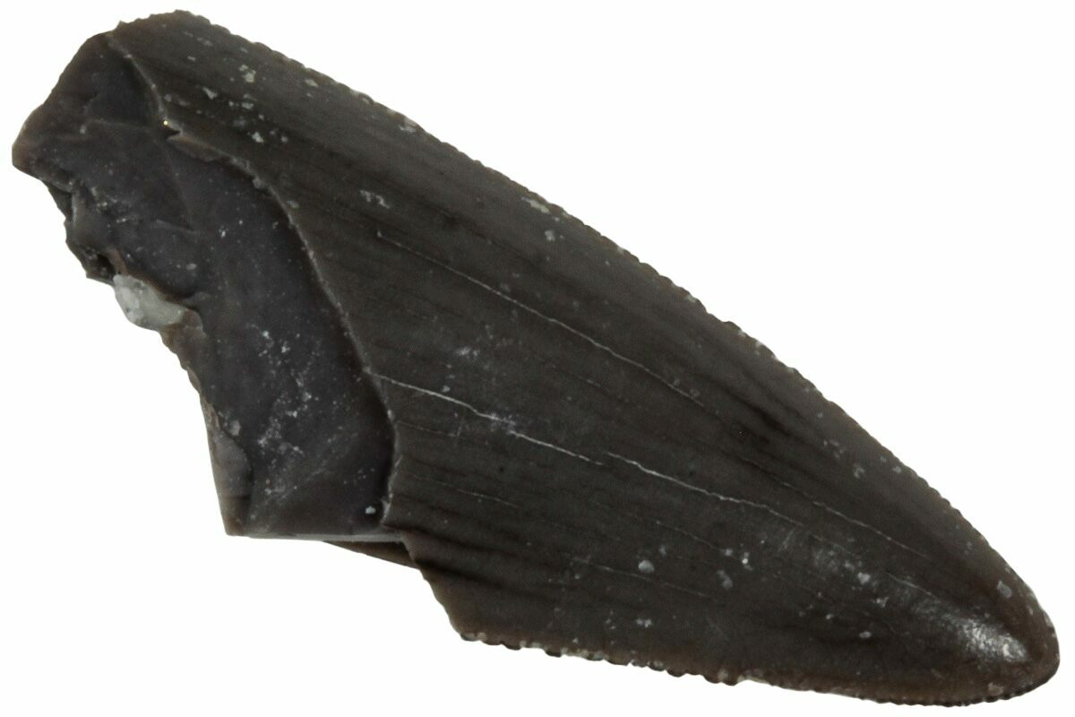 This is a .47" long, serrated, Triassic reptile (Postosuchus?) tooth from the Chinle Formation of Arizona. It has beautiful black-grey preservation and fine serrations.