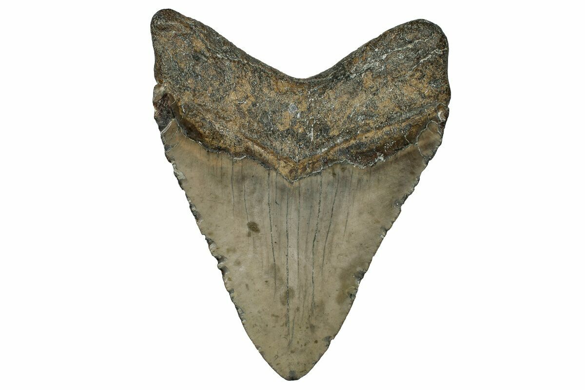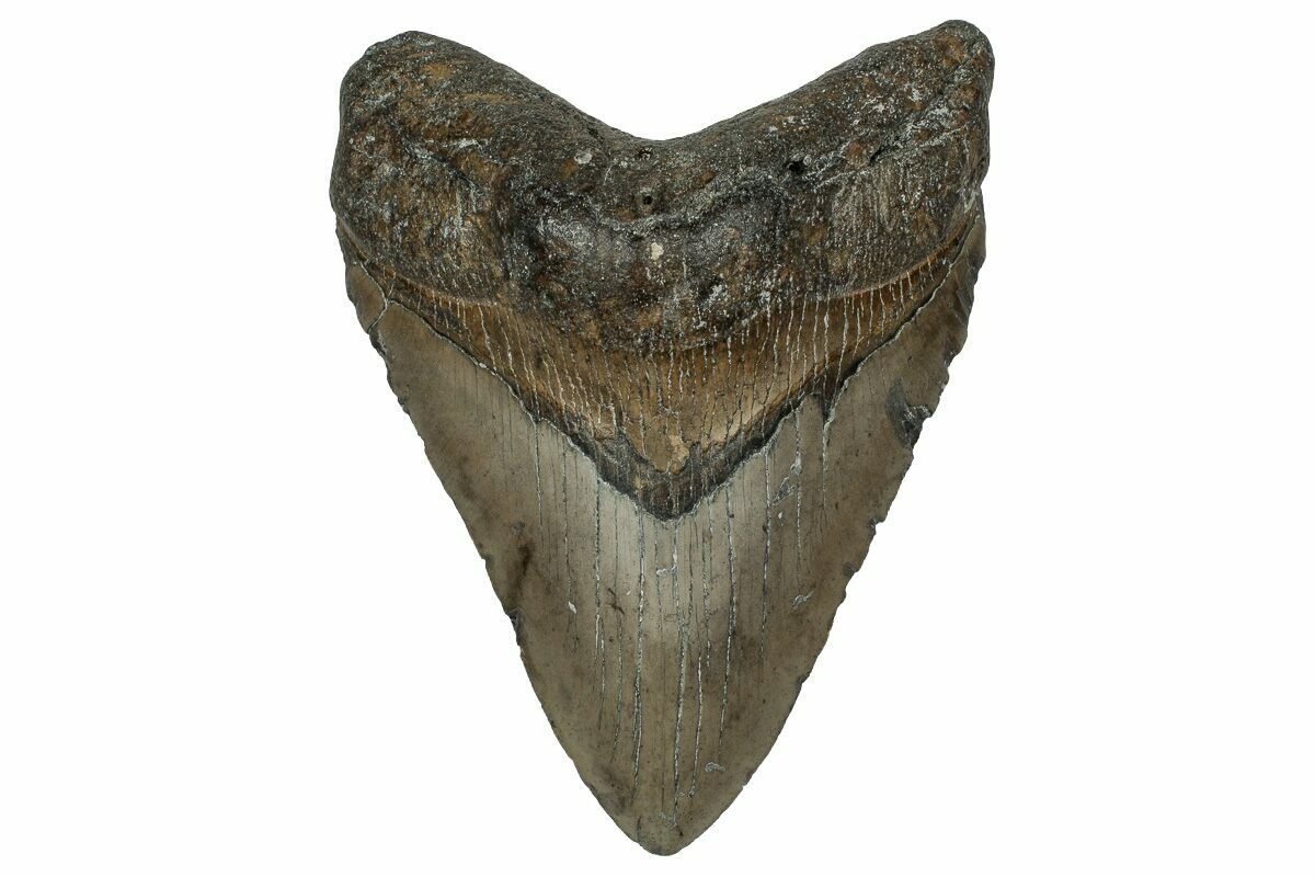 The standard measure for megalodon teeth is slant height, or the longest edge of the tooth. Adult megalodon teeth were typically in the 4 to 5 inch range: teeth over 6 inches are rare and represent super-sized individuals. Only a handful of teeth have ever been found over seven inches.