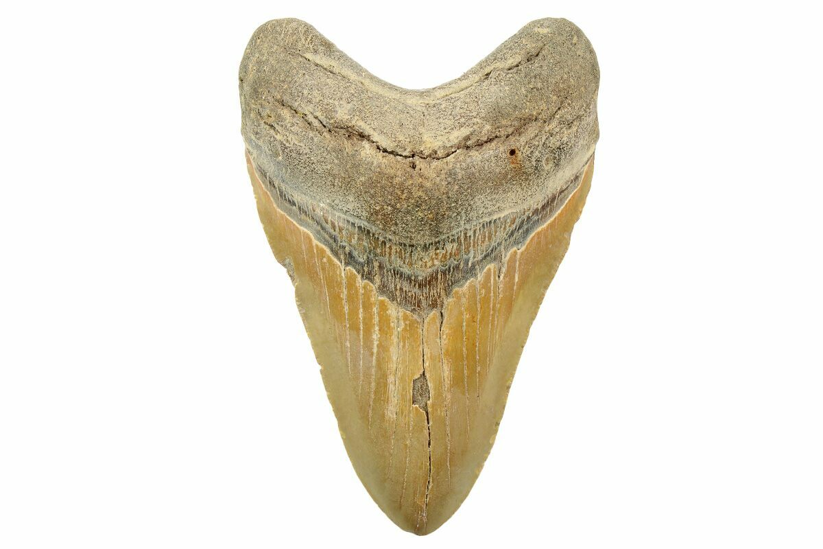 This is a large, 5.01" long megalodon tooth collected on the North Carolina coast. It was found by commercial divers collecting "the ledges" in about 100 feet of water. The tooth would have eroded out of the Pungo River Formation when sea levels were lower and the area where these teeth are found was at the shoreline. The fossil tooth itself would be from between 13.8 to 16 million years old. A tooth of this size would have come from a prehistoric mega-shark in the 45+ foot size range.