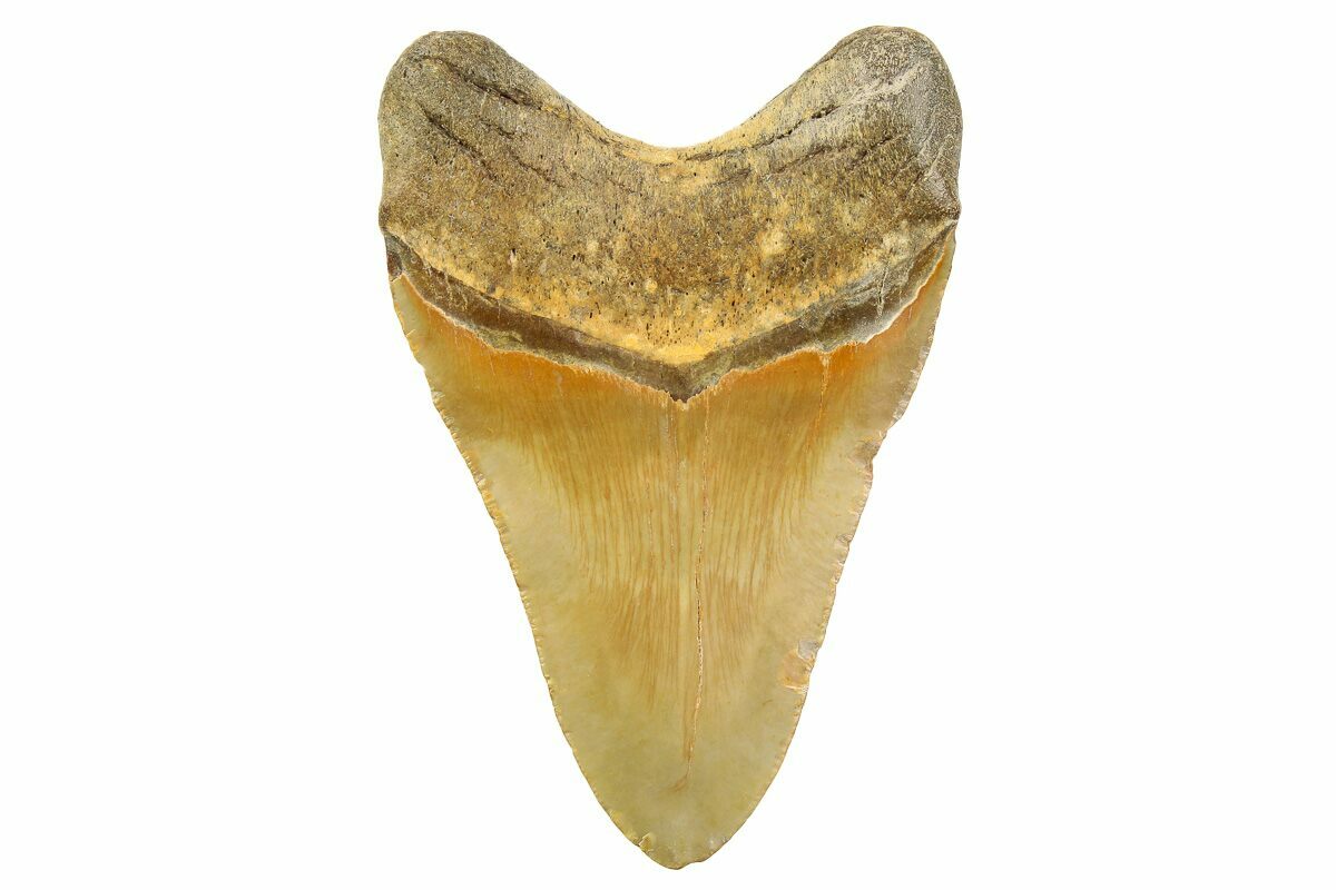 The standard measure for megalodon teeth is slant height, or the longest edge of the tooth. Adult megalodon teeth were typically in the 4 to 5 inch range: teeth over 6 inches are rare and represent super-sized individuals. Only a handful of teeth have ever been found over seven inches.