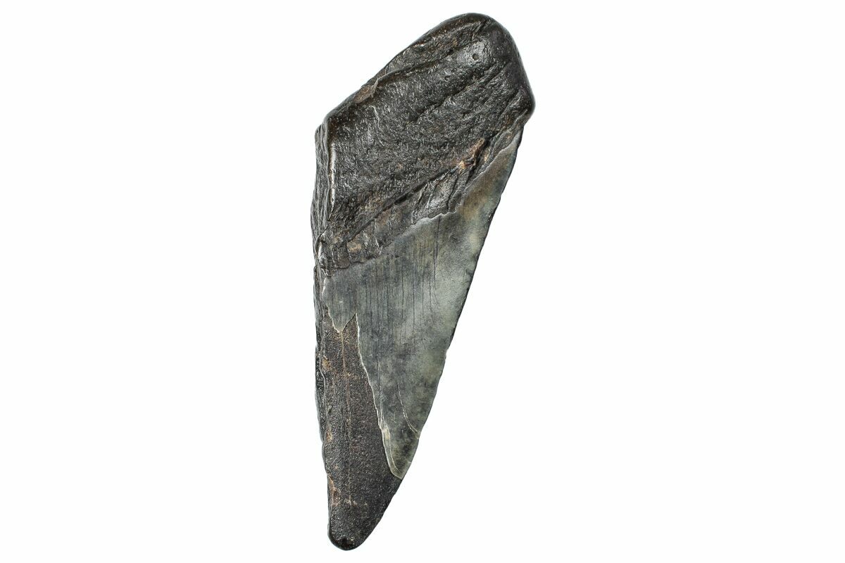 This is a half of a fossil megalodon tooth collected from the Hawthorn Formation in South Carolina. Very often teeth are found broken down the middle and are much more common than finding complete unbroken teeth. Given the size of this tooth, it would have come from a prehistoric, mega-shark in the 40+ foot size range.