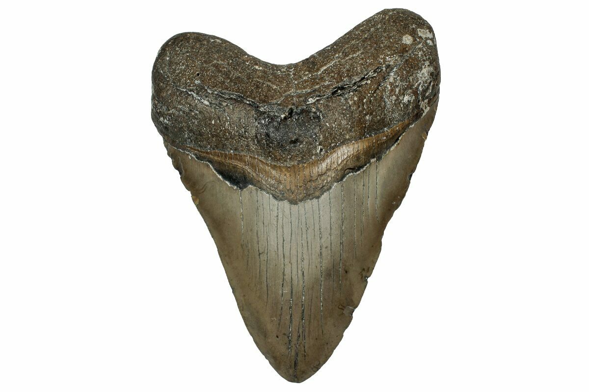 The standard measure for megalodon teeth is slant height, or the longest edge of the tooth. Adult megalodon teeth were typically in the 4 to 5 inch range: teeth over 6 inches are rare and represent super-sized individuals. Only a handful of teeth have ever been found over seven inches.
