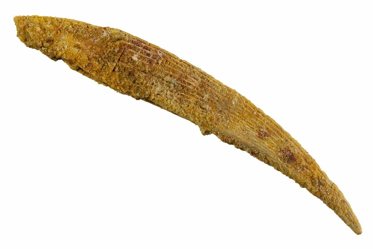 This is a 5" long fossil dorsal spine of a shark (Hybodus obtusus). It comes from the Late Cretaceous-aged Kem Kem Beds near Taouz, Morocco. These spines are relatively delicate so they are almost always fractured while in the ground or during collection. This one has a couple crack repairs along its length.